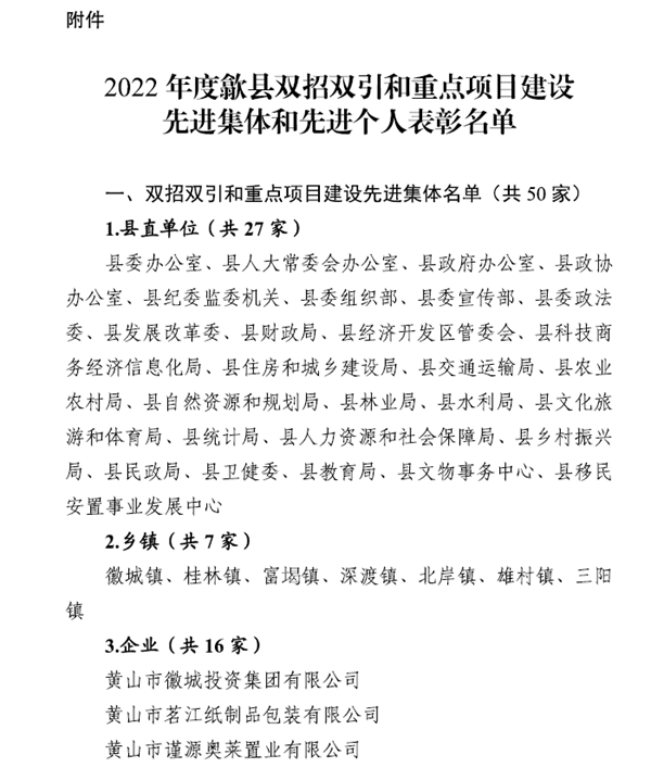 根据《关于2022年度歙县双招双引和重点项目建设先进集体和先进个人评选表彰结果的通报》(歙〔2023〕123号),黄山徽投集团荣获2022年度歙县双招双引和重点项目建设先进集团和先进个人(3人)。